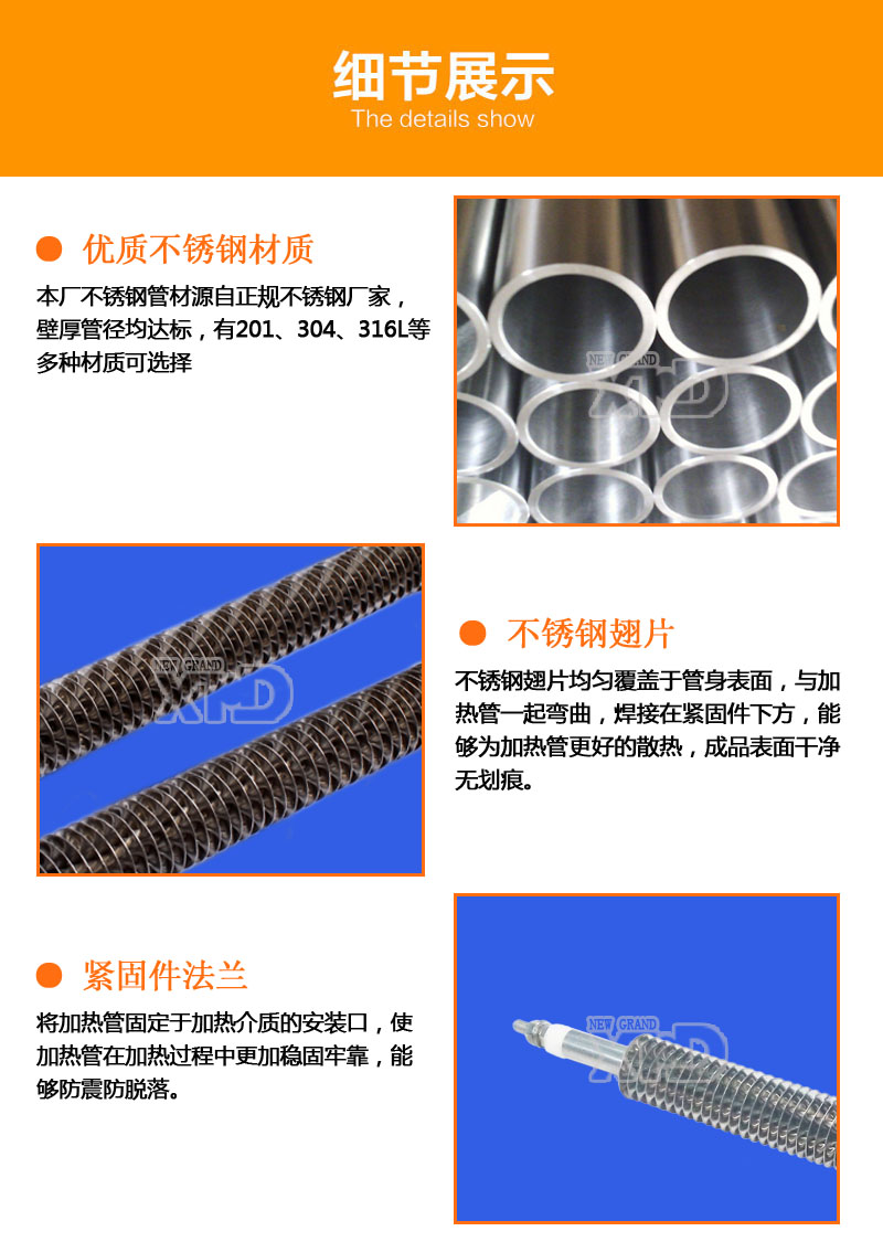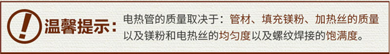 產(chǎn)品組成:優(yōu)質(zhì)不銹鋼、進口氧化鏷粉、高電阻電熱合金絲、不銹鋼散熱片等材料