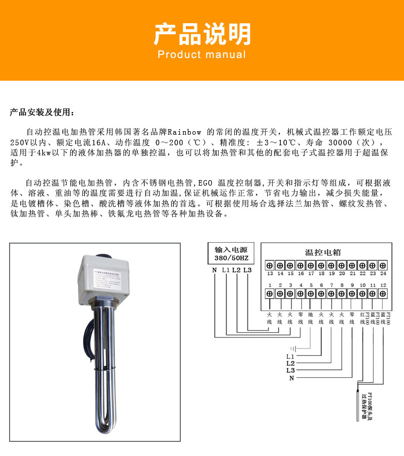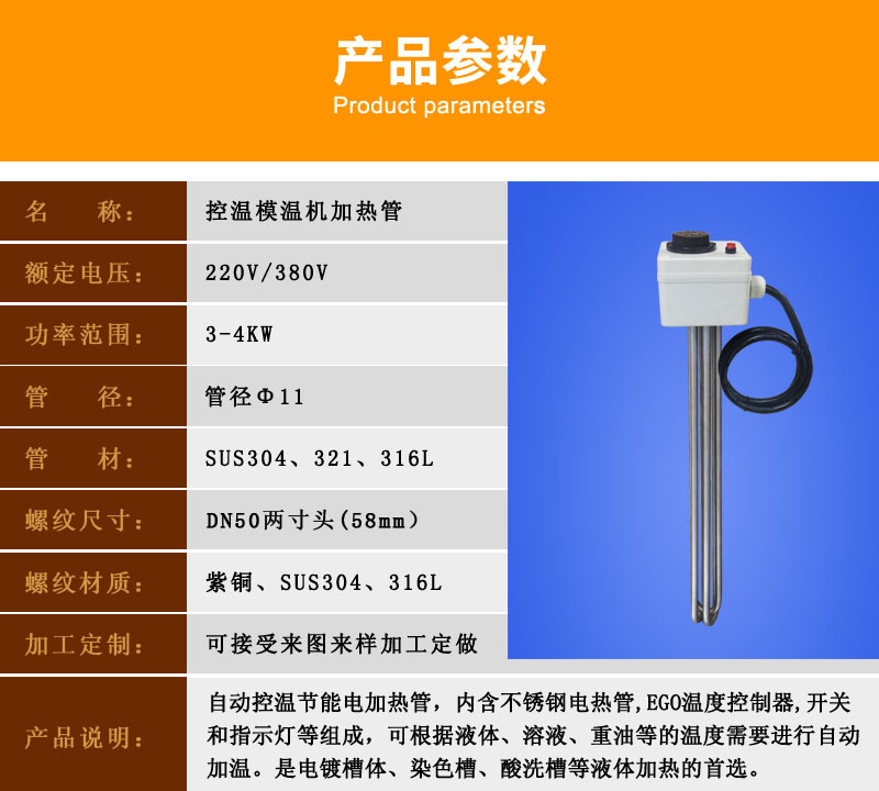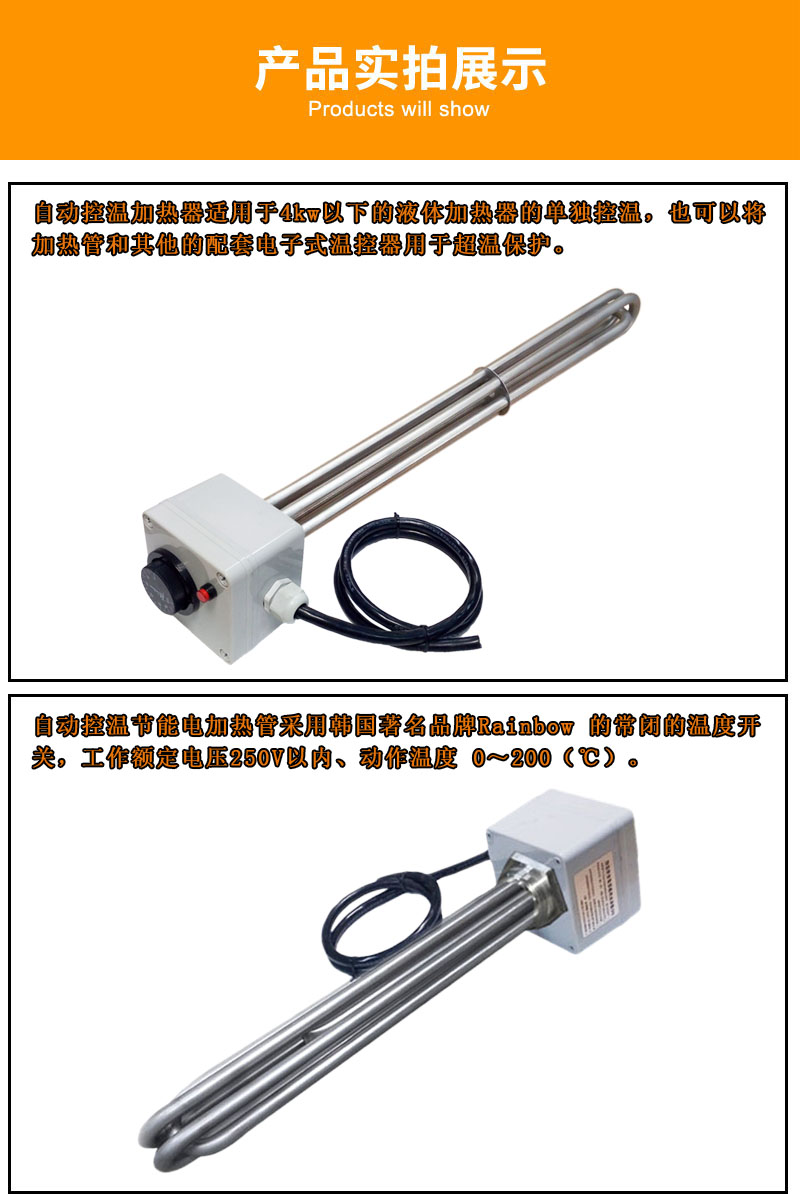 自動控溫節能模溫機電加熱管,內含不銹鋼電熱管,EGO 溫度控制器,開關和指示燈等組成,可根據液體、溶液、重油等的溫度需要進行自動加溫,保證機械運作正常,節省電力輸出,減少損失能量,是電鍍槽體、染色槽、酸洗槽等液體加熱的首選。可根據使用場合選擇法蘭加熱管、螺紋發熱管、鈦加熱管、單頭加熱棒、鐵氟龍電熱管等各種加熱設備。